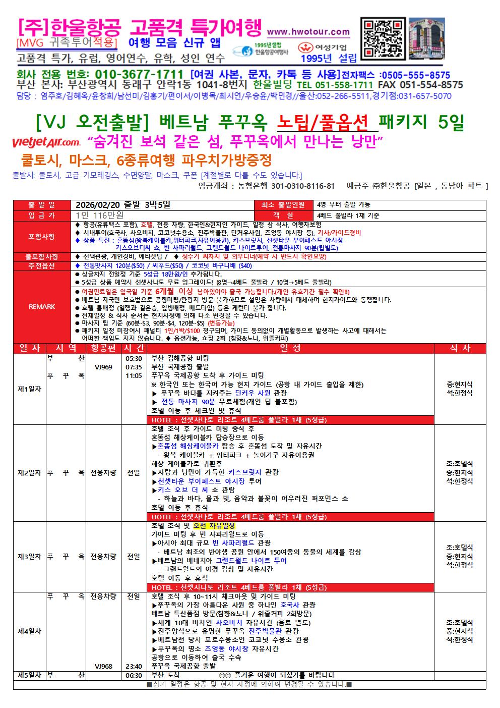 [부산출발] 2026년 2월20일 출발확정 베트남 푸꾸옥 노팁 노옵션 5일