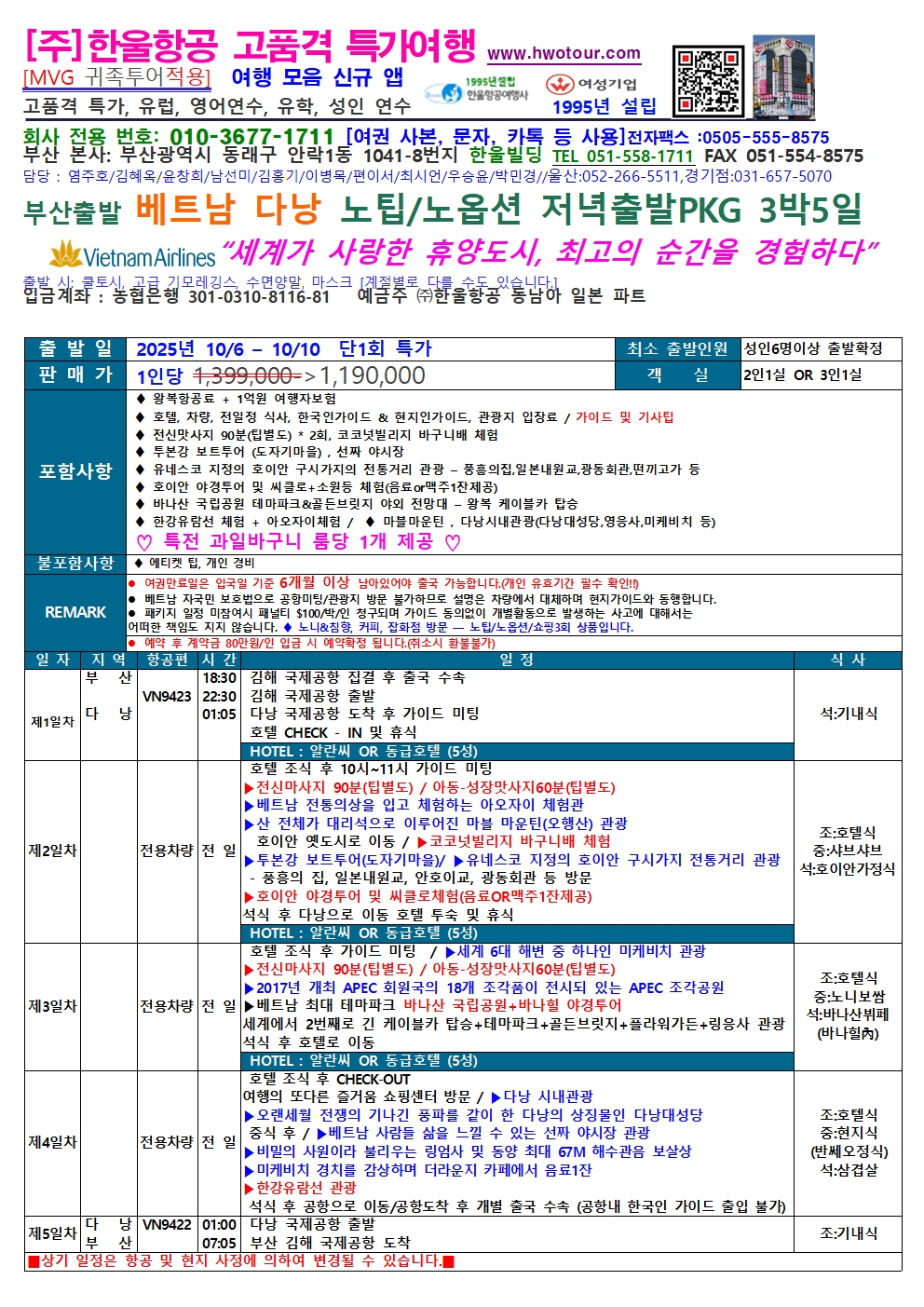 부산출발 추석연휴 ,VN 1급 항공사 베트남 다낭 노팁/노옵션 저녁출발5일