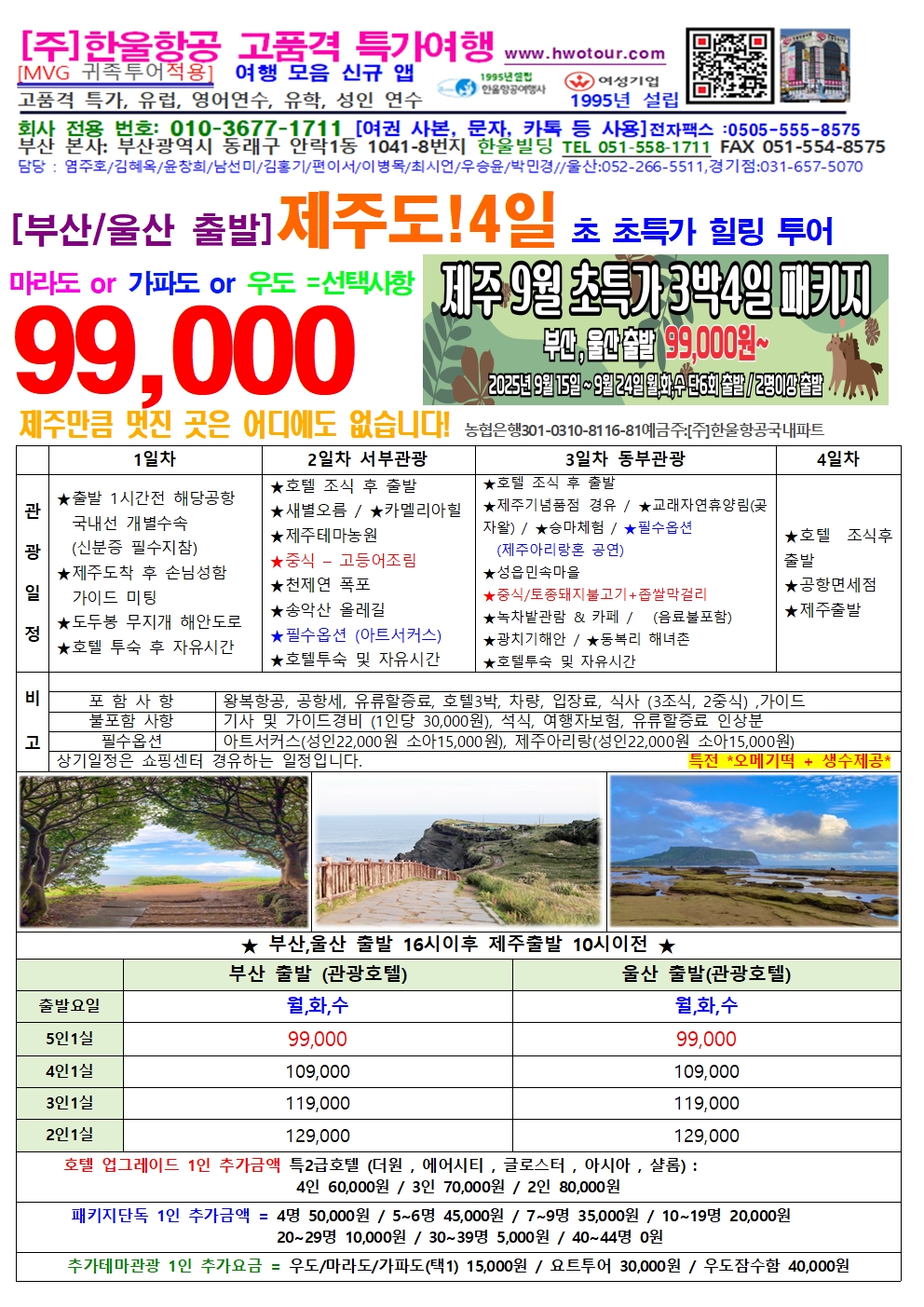 [부산,울산 출발] 제주도 4일 99,000원 초특가 항공+숙박“걷는 길마다 제주의 숨결과,