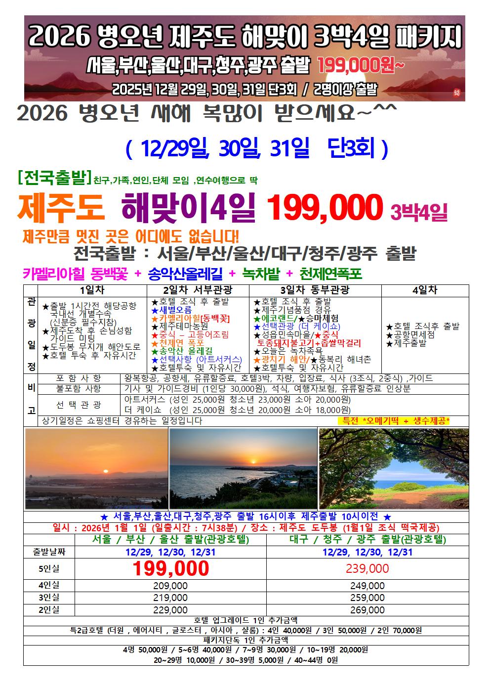 [전국 출발]제주도,너는 해맞이 어디서 보내고 싶니!!!제주도 병오년 해맞이 행사 3박 4일 특가 패키지12월 연말 단 3회!!!우리 모두 새해 소원을 빌어봐요