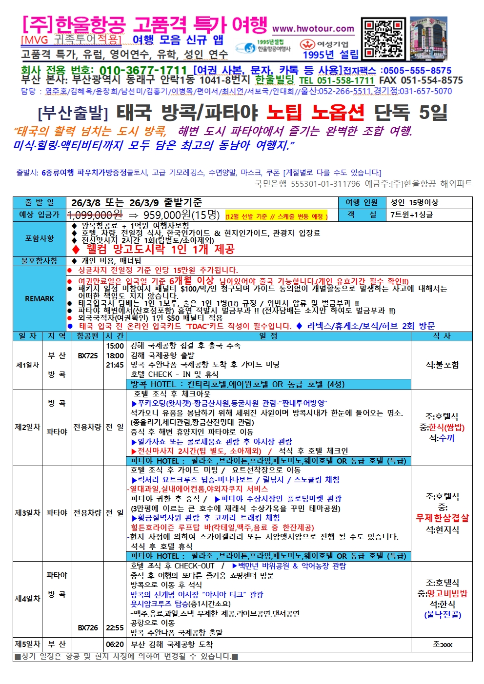 [부산출발] 태국 방콕/파타야 ,태국 방콕 칸차나부리 노팁 노옵션 단독 5일 2가지 상품 :"꼭! 가봐야 할 관광지"