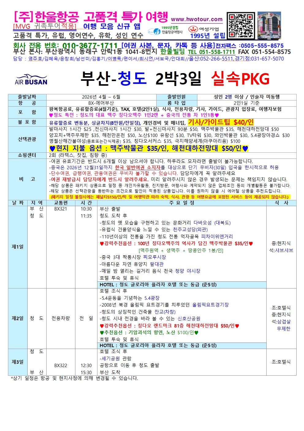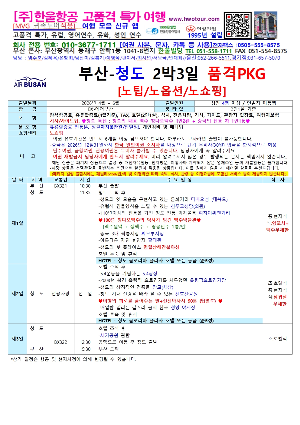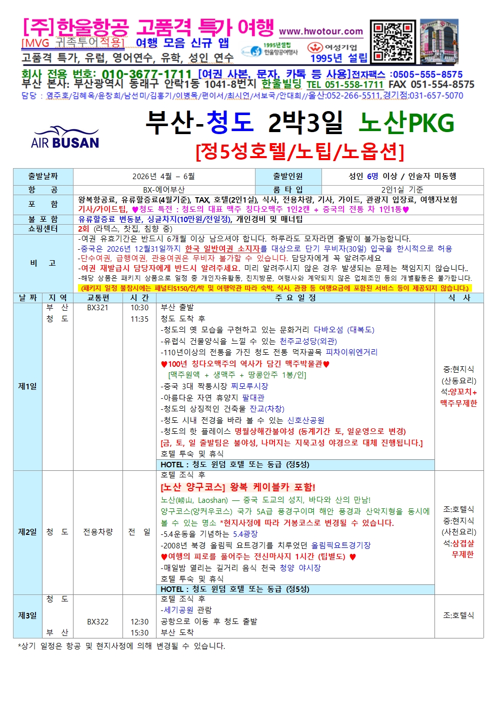 [준5성호텔+ 특식2회+ 칭다오 맥주1인 2캔+ 전통차 1인 1통]