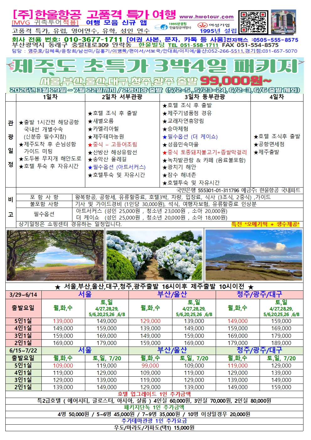 [ 전국출발 서울 부산 울산 대구 청주 광주 ] ✈️ 제주도 12가지 품격 2일 / 3일 / 4일 (노팁, 노옵션, 올포함) “제주도 인기코스 한눈에! 여행 모음 BEST” 바다·자연·맛집까지 고객님 제주도 많이 다녀오셨줘~ 제주도 만큼 좋은 곳은 없어요~~^^ ✈️ 특가부터 힐링코스까지 한 번에! |