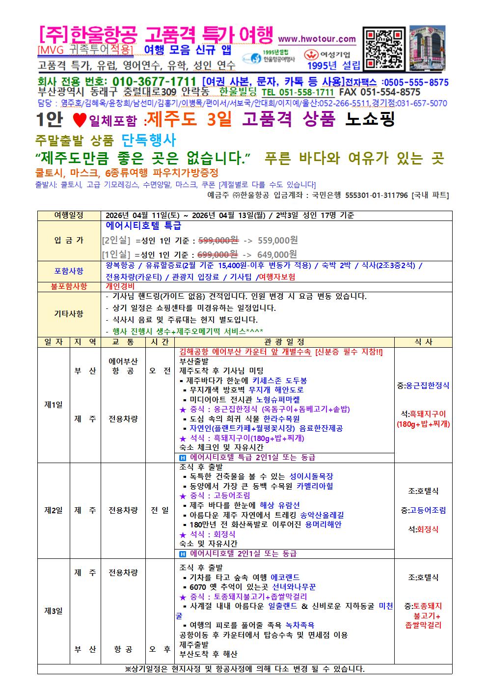 [ 부산출발] ✈️ 제주도 3일 주말출발 고품격 3일 (노팁, 노옵션, 노쇼핑 올포함)