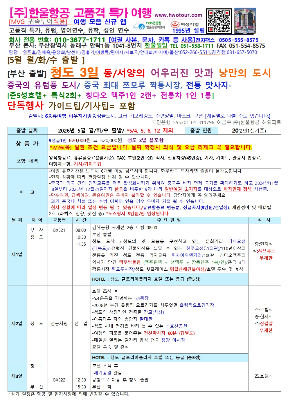 [준5성호텔+ 특식2회+ 칭다오 맥주1인 2캔+ 전통차 1인 1통]