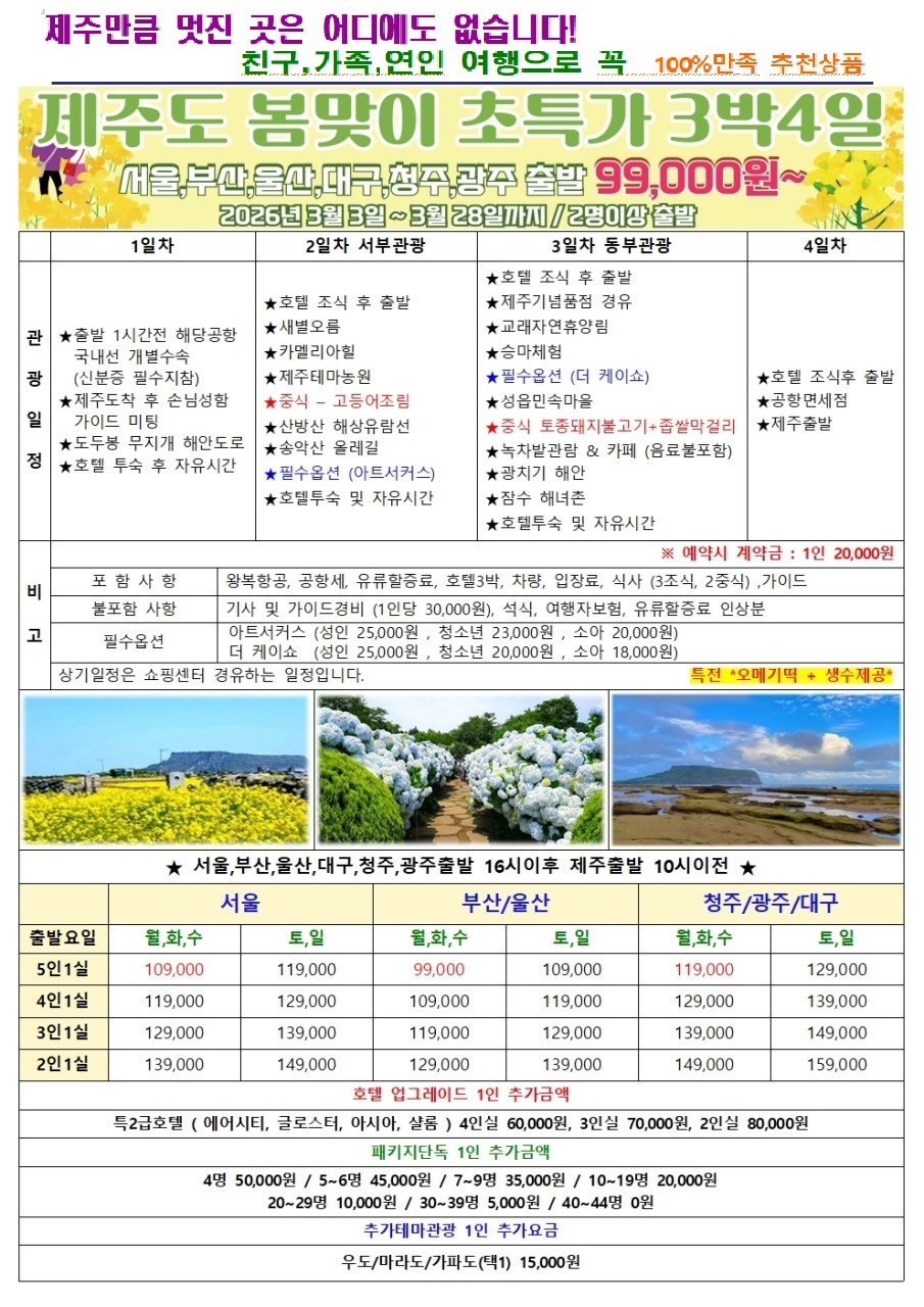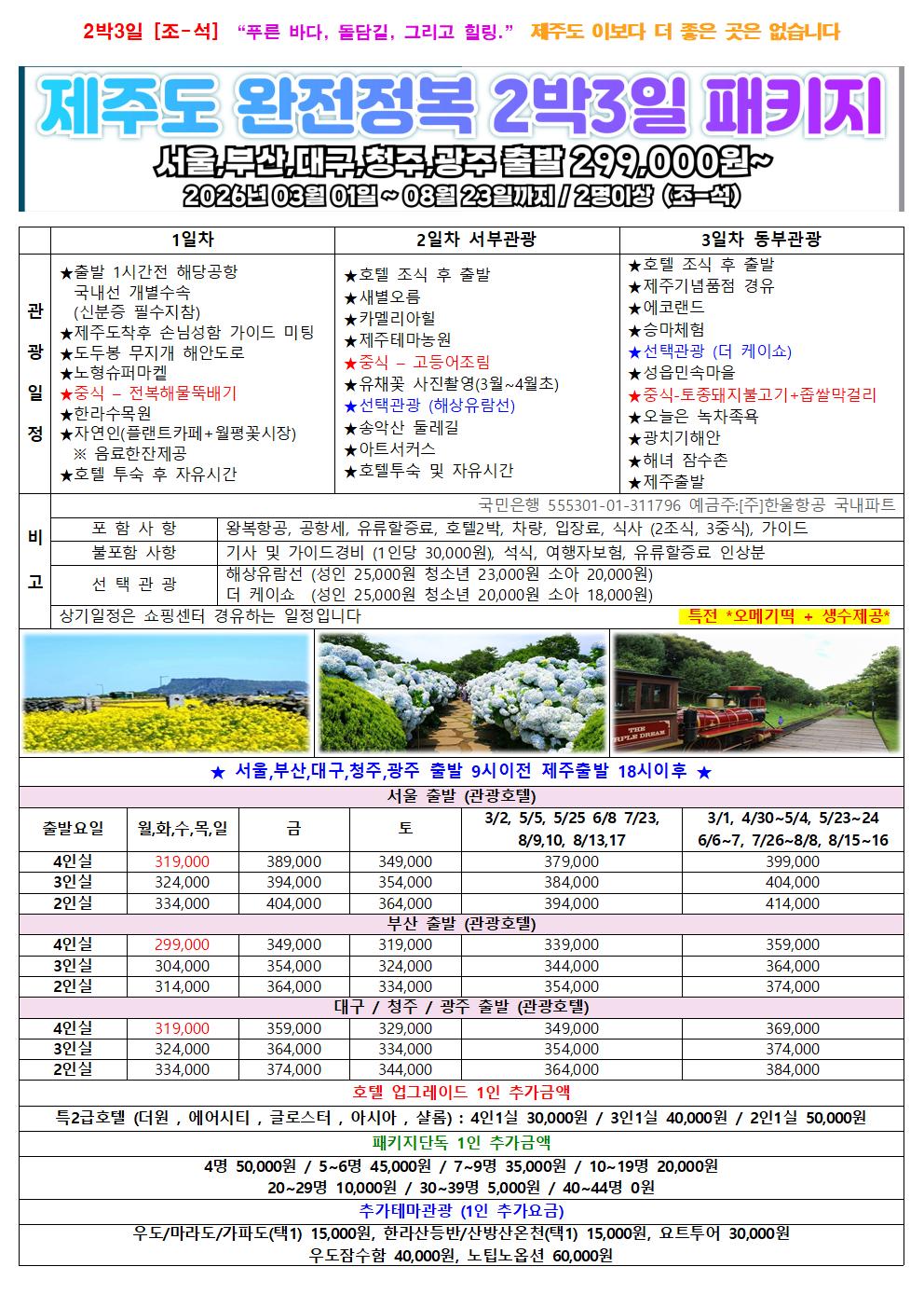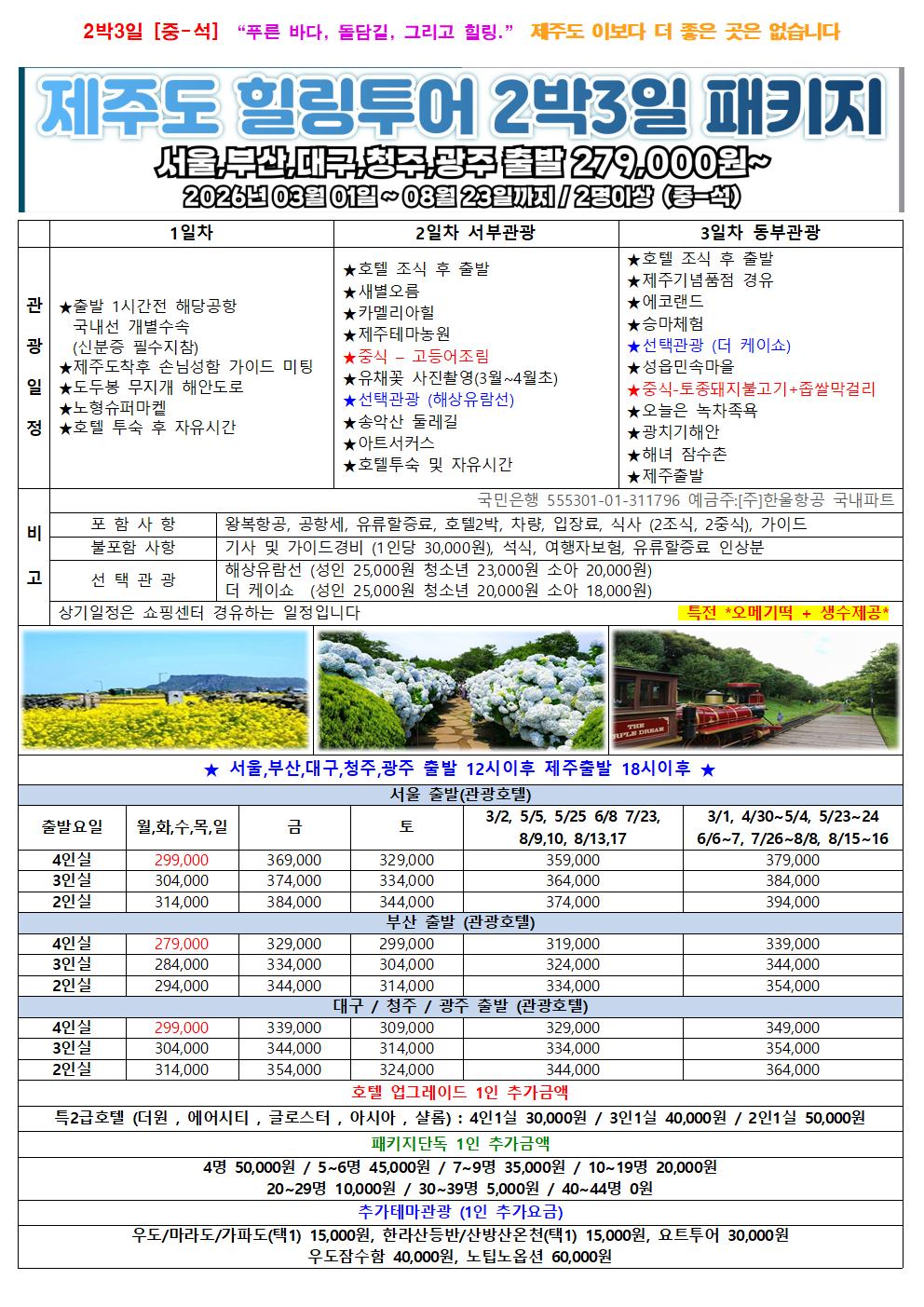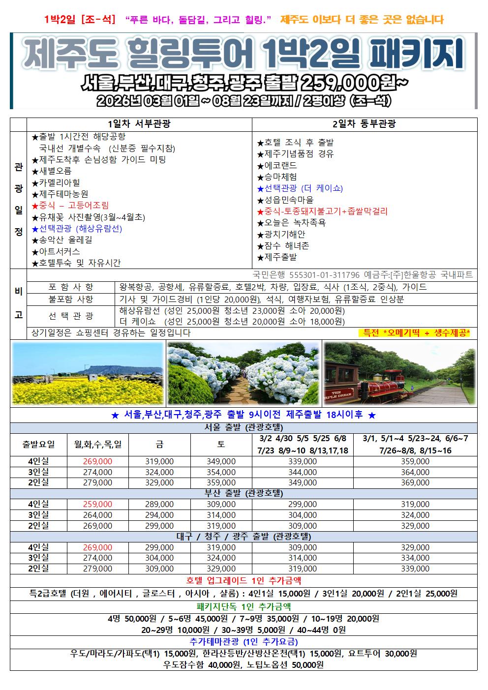 [전국출발] 제주도 12가지 상품 2일/3일/4일 일정 (노팁,노옵션,노쇼핑)