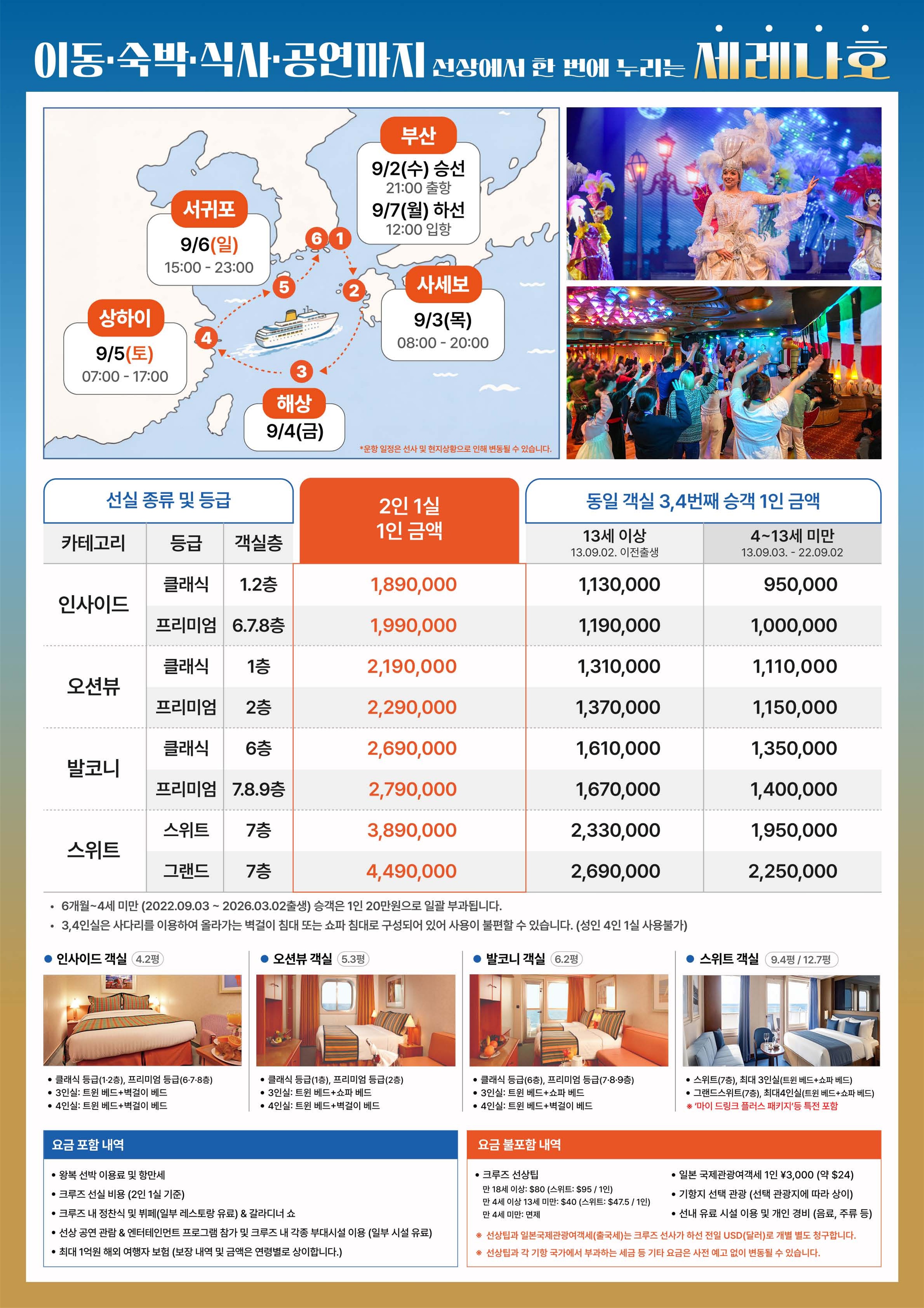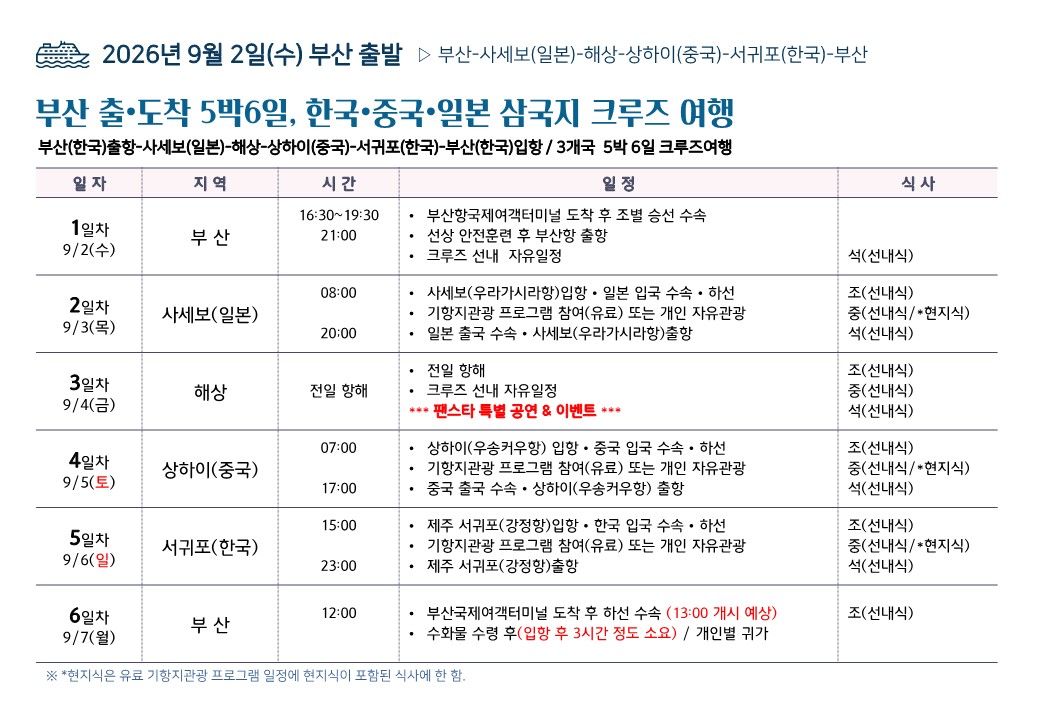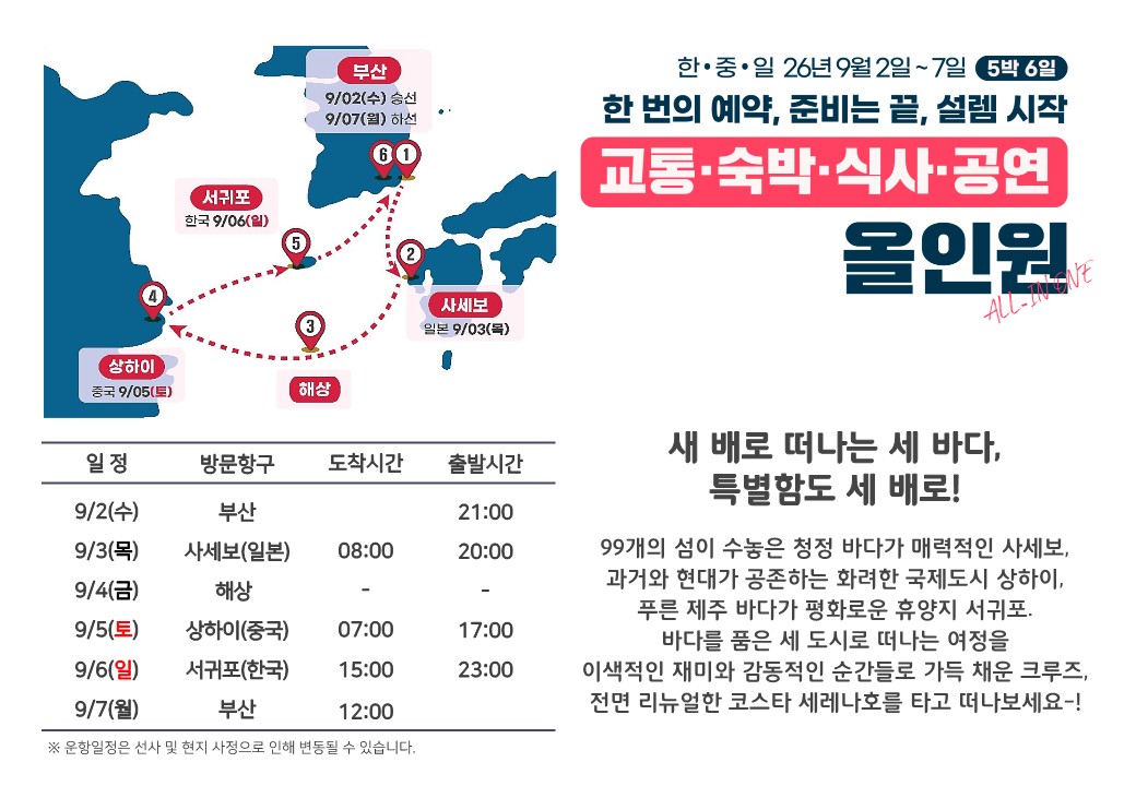 [부산출발] 9월2일 출발확정 한국, 중국, 일본 3개국 크루즈 '코스타 세레나호'로 떠나는 5박 6일
