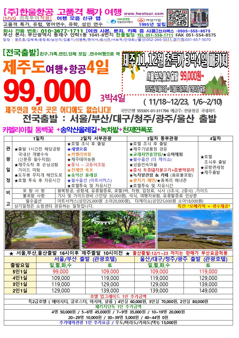 [전국출발] 제주도 항공+여행 4일 99000원 항공+숙박