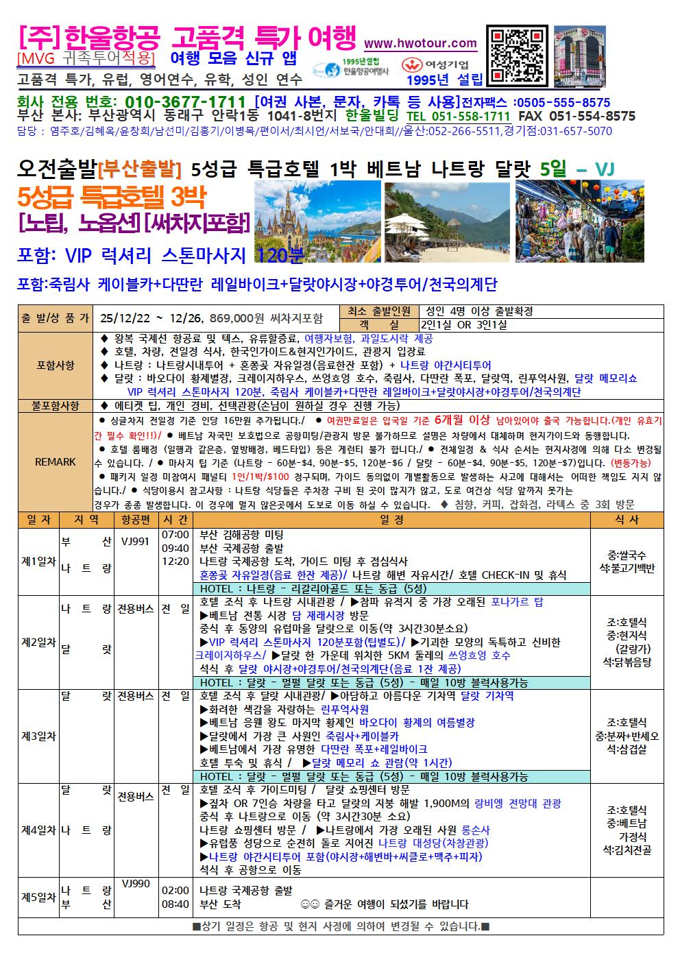 25.12.22 오전출발[부산출발] 5성급 특급호텔 1박 베트남 나트랑 달랏 5일 – VJ