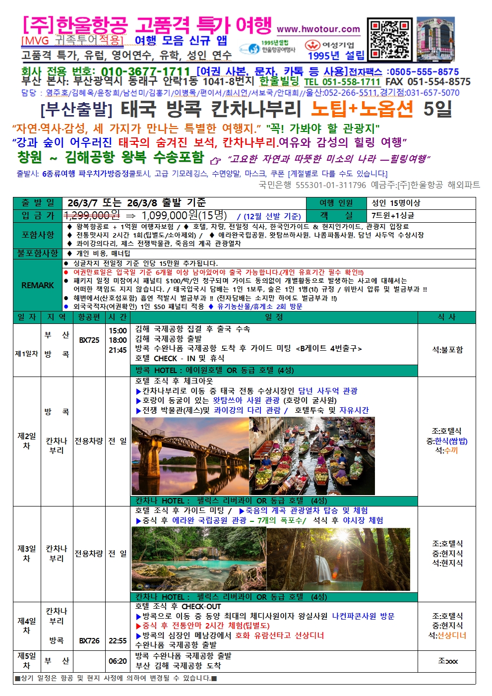 [부산출발] 창원 공항 왕복수송 태국 방콕/파타야 ,태국 방콕 칸차나부리 노팁 노옵션 단독 5일 2가지 상품 :"꼭! 가봐야 할 관광지"