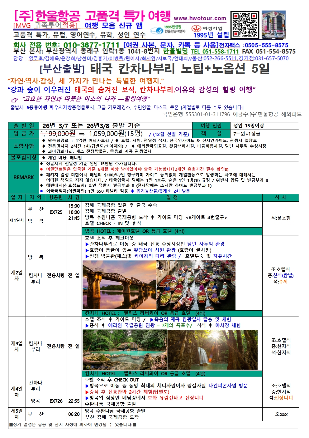 [부산출발] 태국 방콕/파타야 ,태국 방콕 칸차나부리 노팁 노옵션 단독 5일 2가지 상품 :"꼭! 가봐야 할 관광지"
