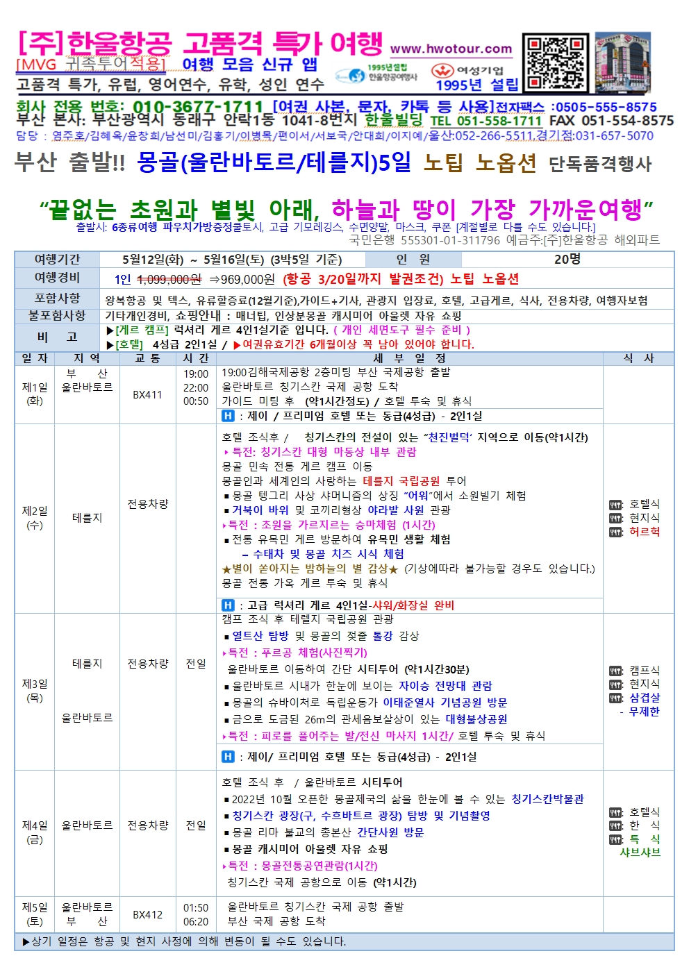[부산 출발] 26년05월12일 단독품격행사 몽골(울란바토르/테를지)5일