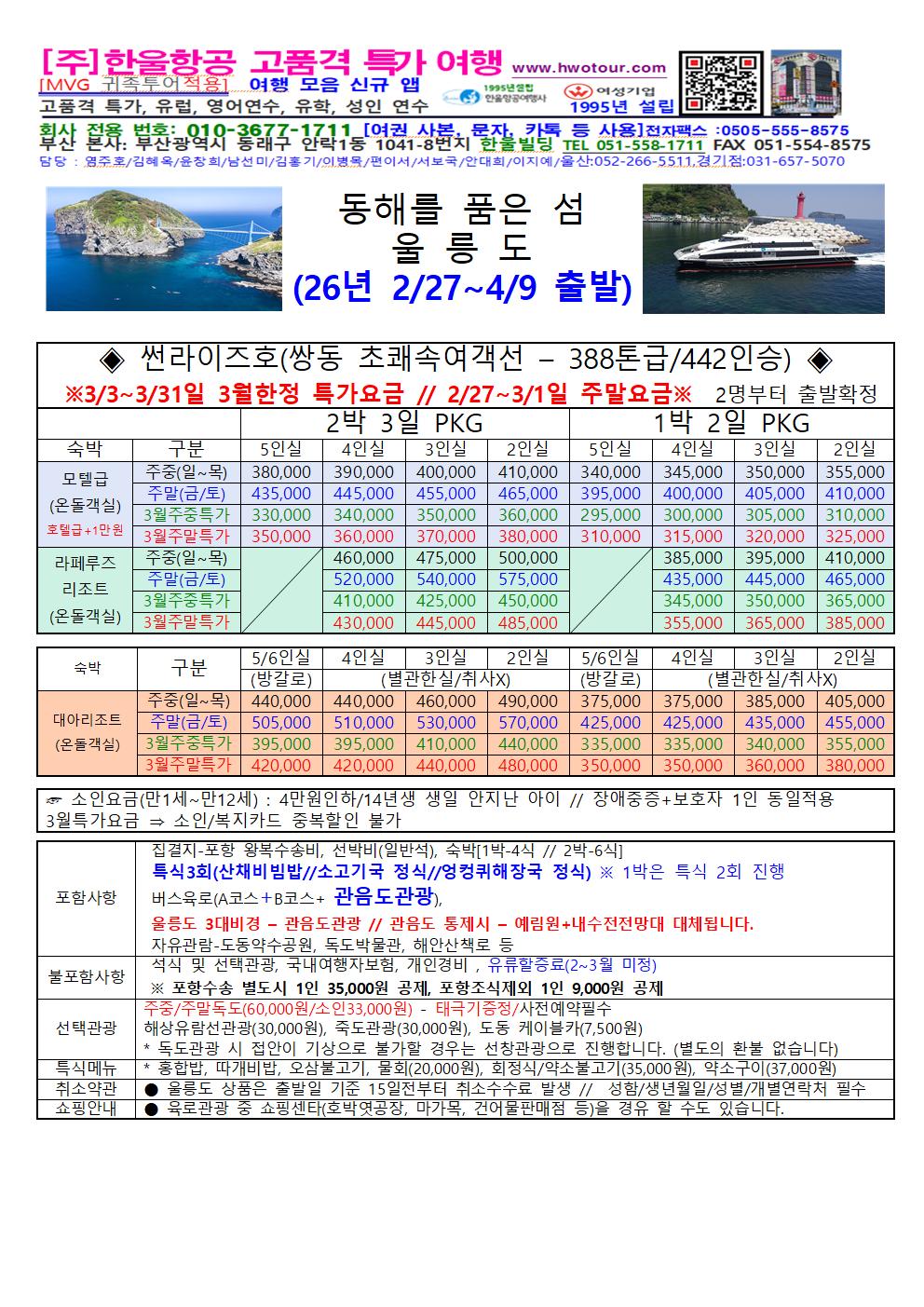 [전국출발] 울릉도 1박 2일 2박 3일 엘도라도 EX호 썬라이즈호 초대형 쾌속선 또는 울릉 크루즈 [1200명탑승]