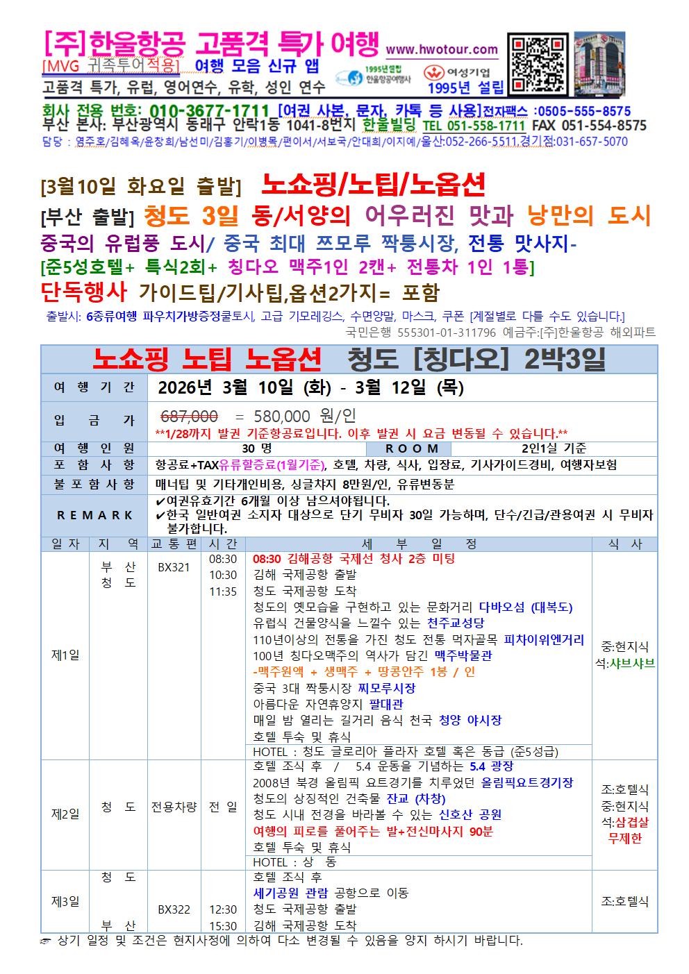 [준5성호텔+ 특식2회+ 칭다오 맥주1인 2캔+ 전통차 1인 1통]