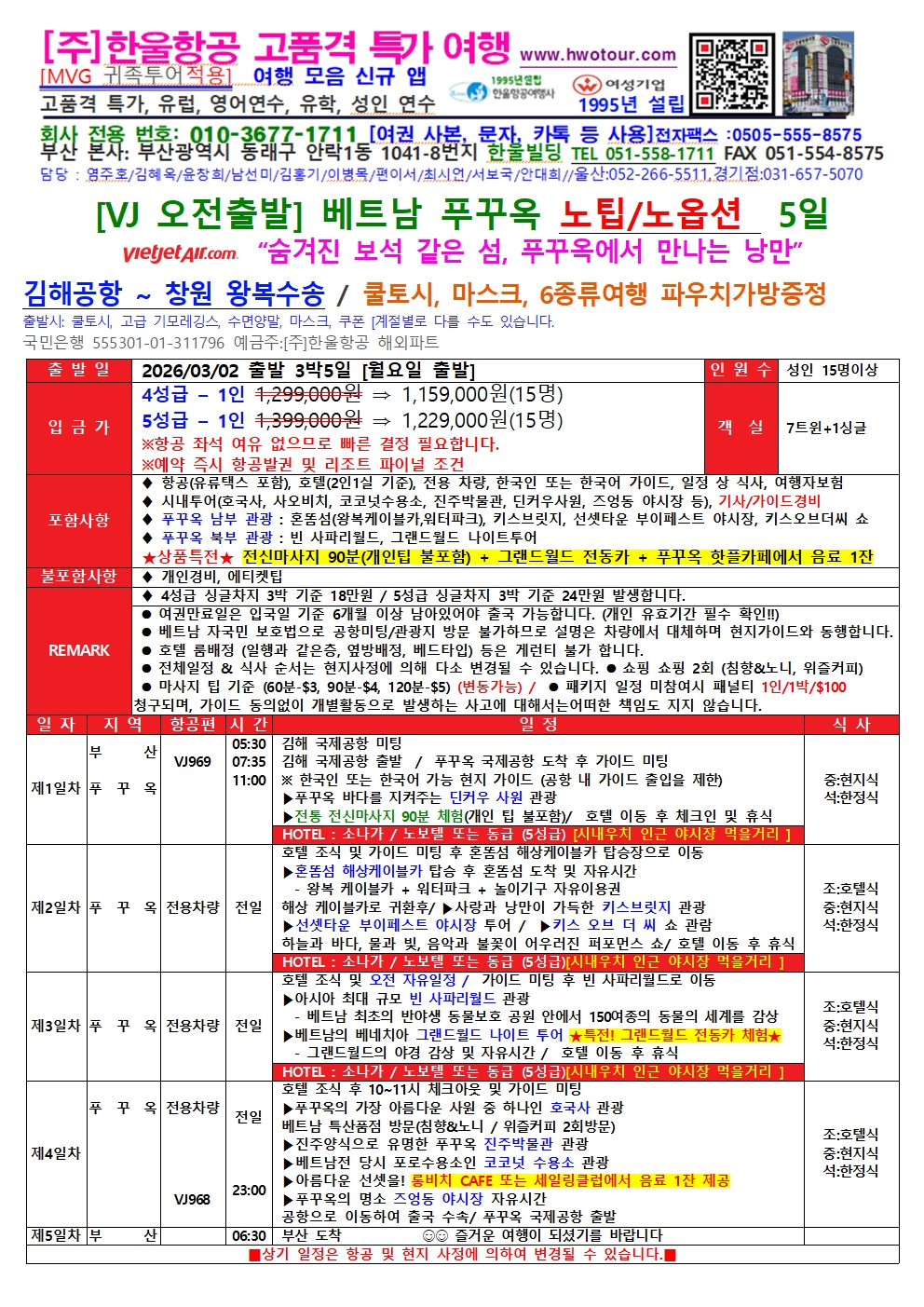 [부산출발] 창원 공항 왕복수송 베트남 푸꾸옥, 노팁 노옵션 단독 5일 상품 :"꼭! 가봐야 할 관광지“