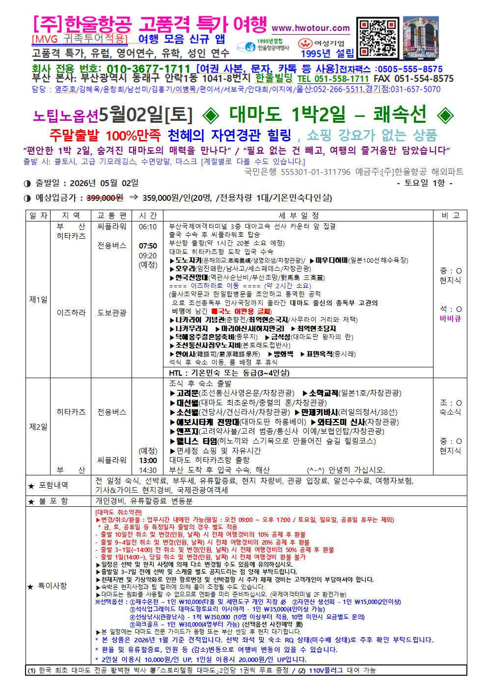 [부산출발] "대마도 5월 2일 단 하루의 설렘!""노팁·노옵션으로 더 완벽한 대마도 1박 2일 주말여행""100% 만족을 약속합니다"