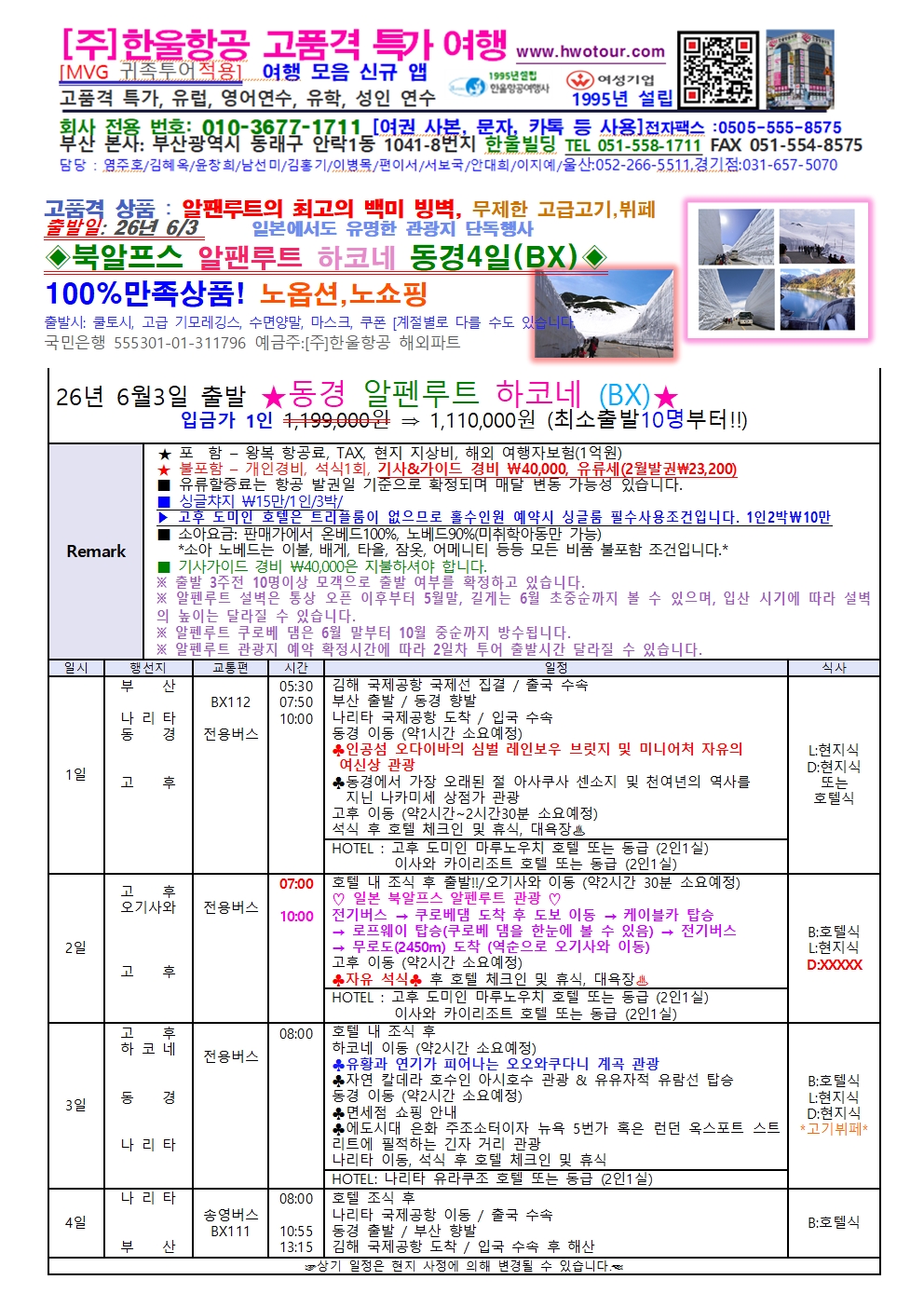 북알프스 알팬루트 하코네 동경 4일 100%만족 노옵션,노쇼핑