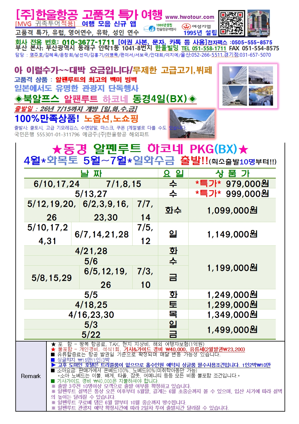 북알프스 알팬루트 하코네 동경 4일 100%만족 노옵션,노쇼핑