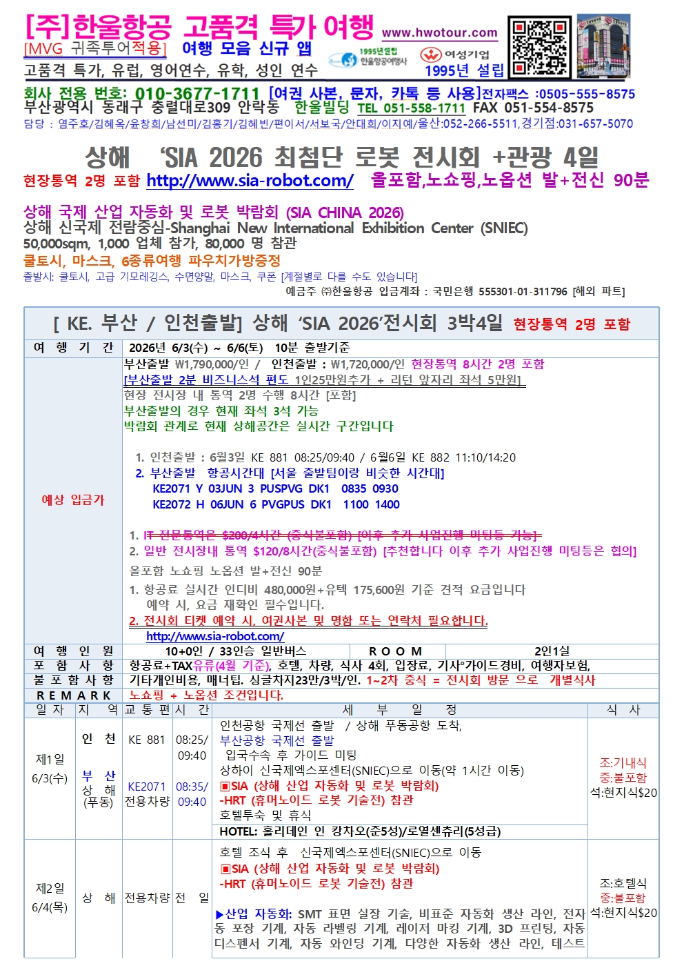 [부산 / 인천 출발] 6월03일 ~06일 [3박4일] 상해 ‘SIA 2026 최첨단 로봇 전시회 +관광 4일 http://www.sia-robot.com/ 올포함 노쇼핑 노옵션 Shanghai New International Exhibition Center (SNIEC) 50,000sqm, 1,000 업체 참가, 80,000 명 참관 |