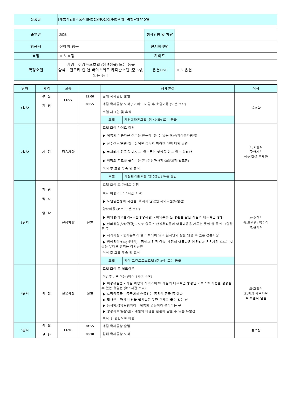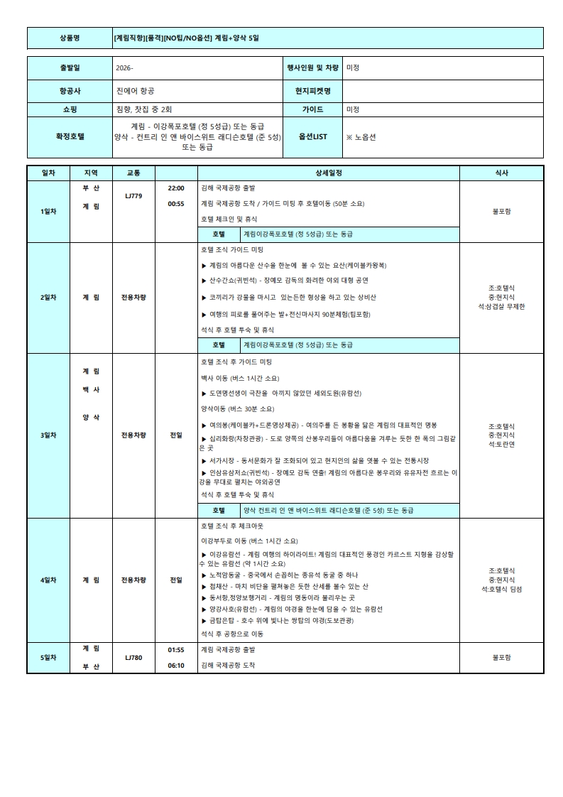 계림 직항 5일 노팁 노옵션 노쇼핑 고품격