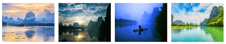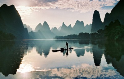 파란하늘과 안개가 걸쳐져 물에 비친 자유로운 기암절벽들과 여유롭게 가마우지를 이용해 물고기를 낚는 어부들의 모습이 배경과 어우러져 아름다운 풍경을 형성합니다.